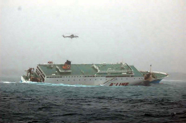 旅客船の左舷後部が強い波を受け、船に積載されていたコンテナや車などの貨物約2400㌧が瞬時に片側に傾き、船がバランスを失って座礁した事故だった。