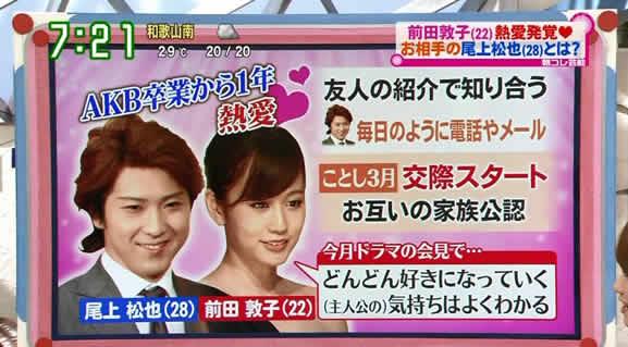 AKB48の選抜総選挙直前の6月6日深夜から7日未明にかけて、前田敦子(22)が都内の大衆居酒屋で俳優仲間と会合を開いた。前田は人目も憚らず、仲間を前に恋人・尾上松也(29)との順調な交際ぶりを報告。彼女の口からは“結婚宣言”まで飛び出した。