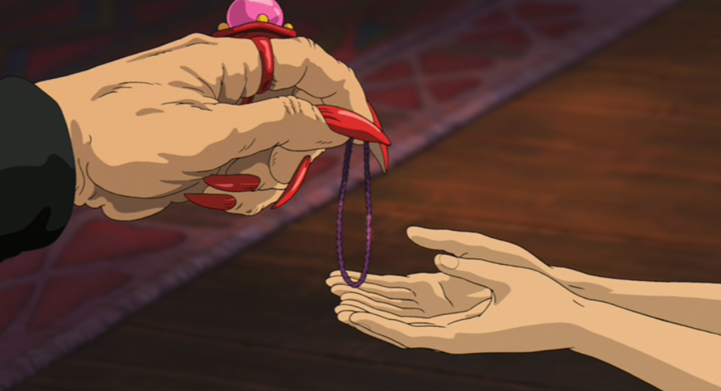 ハクは八百万の神々が客として集う「油屋」という名の温泉宿で働いており、その宿の主人は、相手の名を奪って支配する、恐ろしい魔女の湯婆婆(ゆばーば)。この世界で仕事を持たない者は、湯婆婆によって動物にされてしまうと教えられた千尋は、湯婆婆に仕事をもらえるように頼み込む。