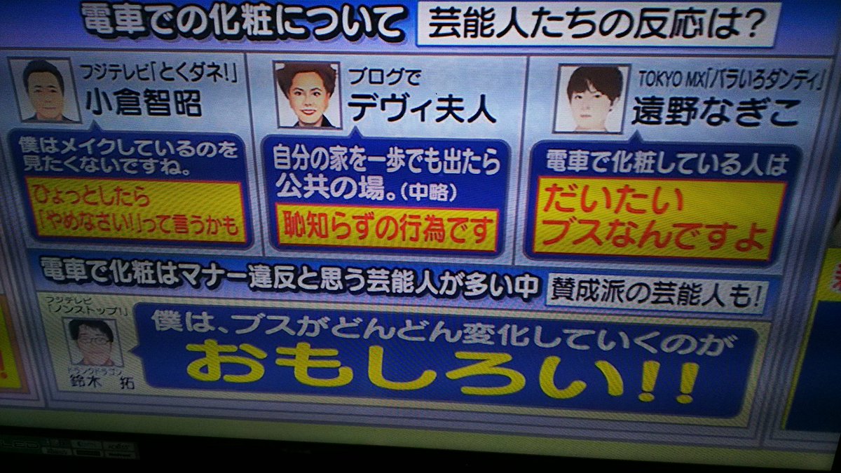 この日の番組ではこの件を取り上げ、テレビ番組で発言された著名人のコメントを紹介。アナウンサーの小倉智昭(69)が10月27日放送の『とくダネ!』(フジテレビ系)で、「僕はメイクしてるのを見たくないですね。ひょっとしたら“やめなさい!”と言うかもしれない」と発言したことや、11月7日放送の『バラいろダンディ』(TOKYO MX)で、女優の遠野なぎこ(36)が「電車で化粧してる人はだいたいブス」と爆弾発言したことなどが紹介された。その直後、番組に出演していた小島瑠璃子が重々しく口を開き「もっとひどい人いると思って。自分の見られ方が悪くなるだけで、人に迷惑かけてないじゃないですか」と発言。続けて「あからさまに大きな声でしゃべってたりとか、もっとひどい人っているなって思っちゃいました」と思いを語った。