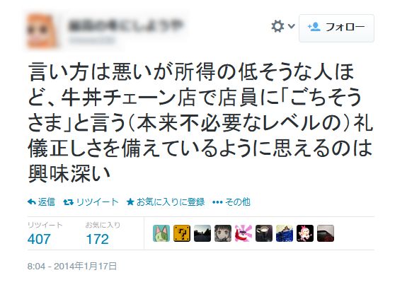 彼氏は牛丼屋で店員に「ご馳走さま」って言うらしい。ドン引きしちゃった