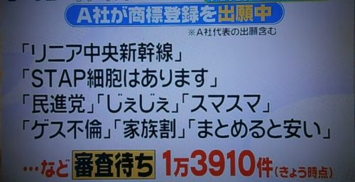 番組では上田氏が他に出願した商標をいくつか紹介していた。「じぇじぇ」「STAP細胞はあります」「終活」「アナと雪の女王」「ダメよ?ダメダメ」「LOVELIVE」といったものから「民進党」「北陸新幹線」まで注目されるワードを次々と申請しており、1日に300件出願することもあるそうだ。