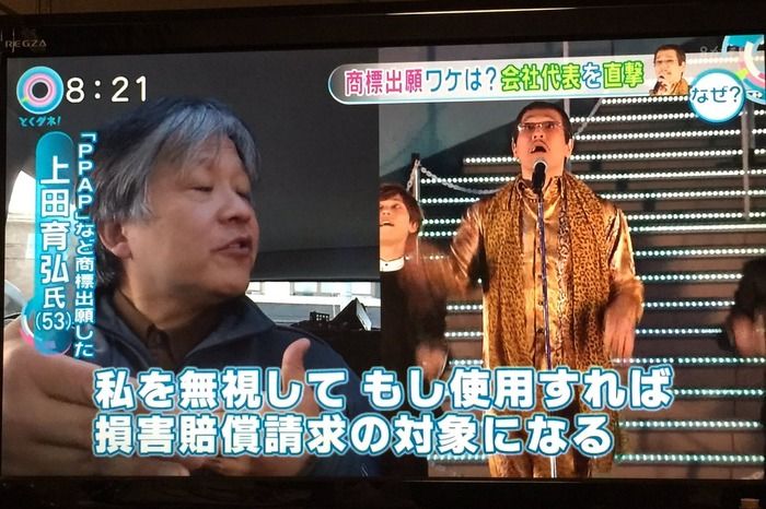 1月26日に放送された『情報プレゼンター とくダネ!』(フジテレビ系)や『情報ライブ ミヤネ屋』(日本テレビ系)でも「ピコ太郎は『PPAP』を使えない?」をテーマにして、ベストライセンス株式会社の上田育弘氏を直撃インタビューした。