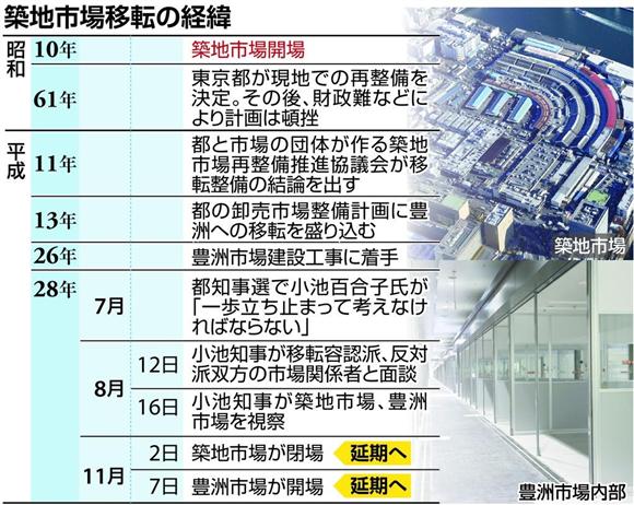 2016年8月30日、東京都知事の小池百合子は、同年秋に予定されていた当市場の移転を延期すると発表した