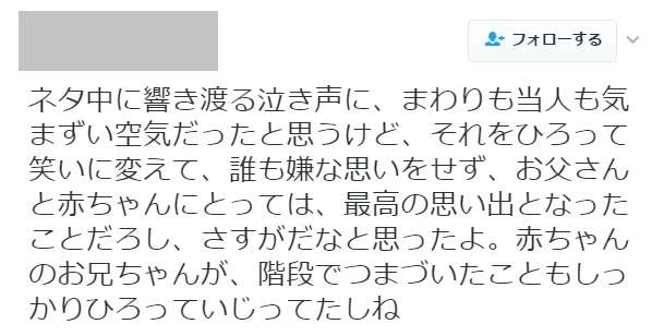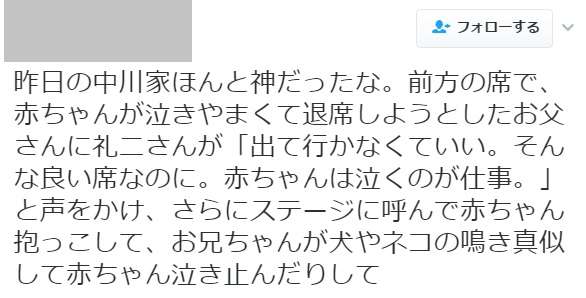 昨日の中川家ほんと神だったな。前方の席で、赤ちゃんが泣きやまくて退席しようとしたお父さんに礼二さんが「出て行かなくていい。そんな良い席なのに。赤ちゃんは泣くのが仕事。」と声をかけ、さらにステージに呼んで赤ちゃん抱っこして、お兄ちゃんが犬やネコの鳴き真似して赤ちゃん泣き止んだりして、なんと「赤ちゃんは泣くのが仕事」と、その赤ちゃんを抱っこしてモノマネも披露したという!これはかっこよすぎるだろ!