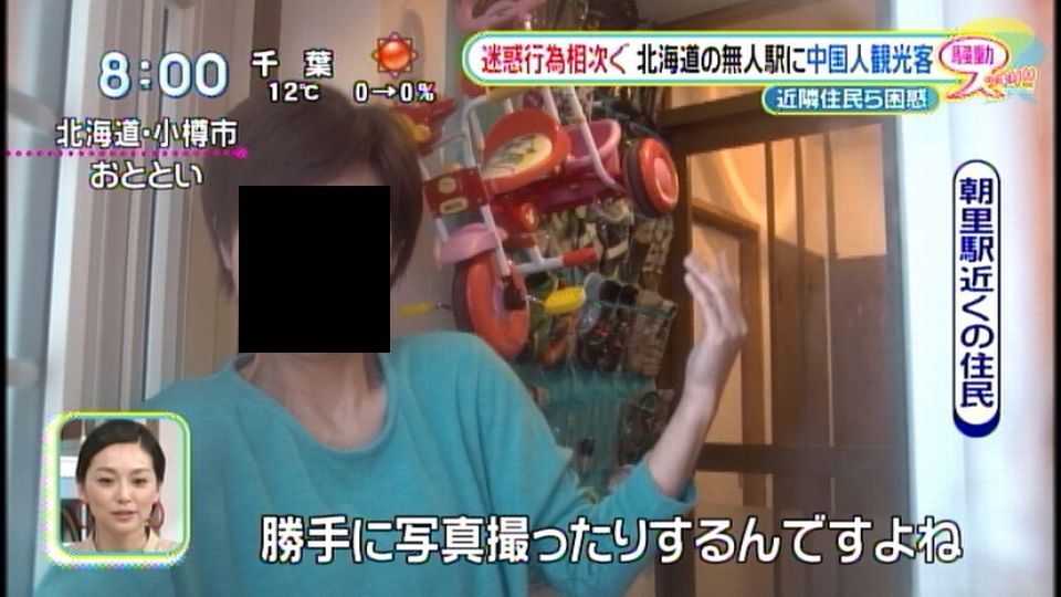 3日放送の日本テレビ系情報番組「スッキリ!!」(月~金曜・前8時)では、北海道・JR函館本線の無人駅「朝里駅」の周辺に中国人観光客が殺到、線路内に入っての写真撮影、他人の敷地への無断侵入など、観光マナーが守られていない現状を取り上げた。