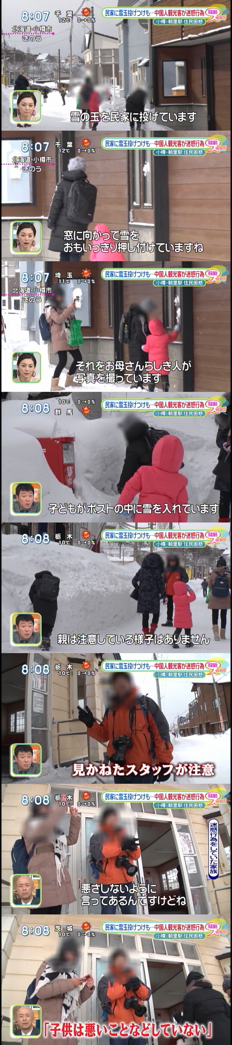 北海道・小樽市出身のMC・加藤浩次(47)は「観光客が増えることは地元の人はありがたいはずだけど…。魚介、寿司はうまいし、いい景色だしね。どうしたらいいんですかね」と地元を思って困惑顔。「ハリセンボン」の近藤春菜(33)は「(子供が)雪玉を投げたりするのは文化の違いじゃなく親の問題。写真を撮るのじゃなく注意してほしい」とコメントした。