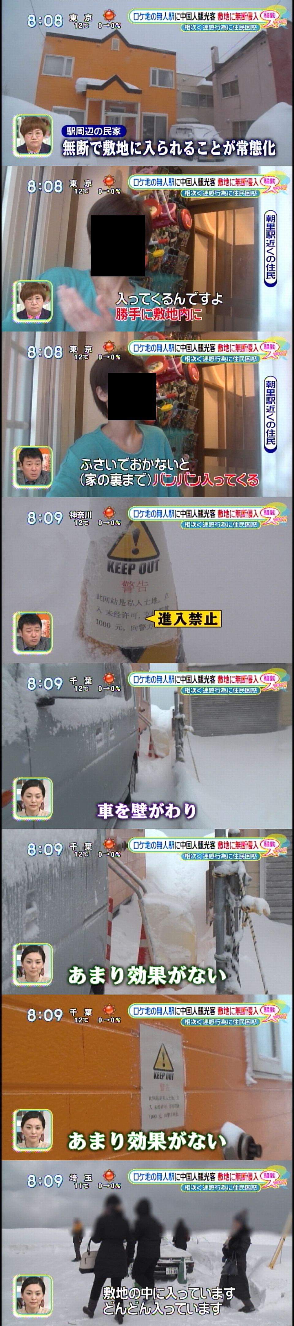 一昨年、中国で大ヒットした映画「恋愛中的城市」のロケ地として有名になった「朝里駅」。劇中では一組のカップルのハネムーン先として雪景色のシーンが印象的に描かれている。聖地巡礼に訪れる人々が年々増え、注目されているが、一部の観光客やその子供がポストに雪を詰めたり、民家への雪玉の投げつけ、地元住民が迷惑している様子が流された。
