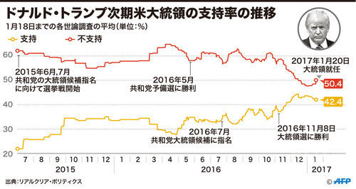 トランプ氏が敬愛するレーガン元大統領も就任直後の支持率は51%と決して高くないが、不支持率は13%にとどまった。トランプ氏と同じく大統領選の総得票数で対立候補を下回ったブッシュ元大統領(子)も、支持率は57%とトランプ氏を上回り、不支持率は25%だった。