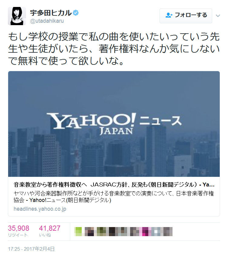 一連の流れに宇多田が反応。この日のツイッターで「もし学校の授業で私の曲を使いたいっていう先生や生徒がいたら、著作権料なんか気にしないで無料で使って欲しいな」とつぶやき、JASRACの方針とは異なる、自身の考えを示した。