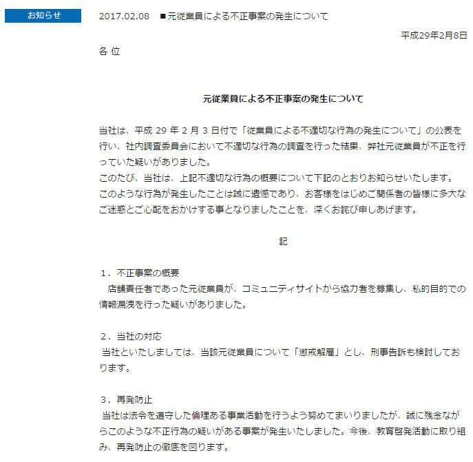 ベラジオは2月8日なり改めて「元従業員による不正事案の発生について」という文章を公開。店舗責任者(店長)はコミュニティサイトから協力者を募集し、私的目的で情報漏洩を行ったとしており、当該従業員を懲戒解雇。更に刑事告訴も検討しているという。