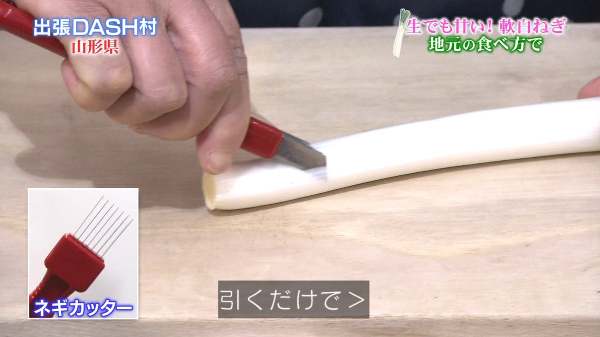『出張DASH村』で山形県鶴岡市を訪れた城島茂と山口達也を待っていたのは、雪国ならではの甘みを醸し出す「雪中軟白ねぎ」。35歳の若さで農業を営む男性から軟白ねぎの栽培方法を習ったあと、料理自慢のお母さんから地元ならではのねぎ料理を教えてもらうことに。料理中に視聴者の目を引いたのが、しゃぶしゃぶを作る際に2人が軟白ねぎをカッターでスイスイと千切りにしていく様子。