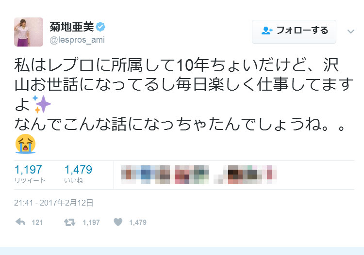 同事務所に所属する菊地は12日、「私はレプロに所属して10年ちょいだけど、沢山お世話になってるし毎日楽しく仕事してますよ」とツイッターで感謝。「なんでこんな話になっちゃたんでしょうね」と嘆いた。