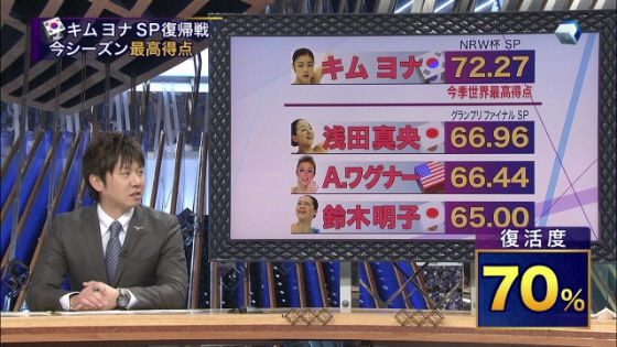 すぽると!ヨナのNRW杯SPの点数の下に、GF2012の浅田、ワグナー、鈴木の点数を並べる