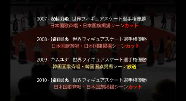 フィギュア世界選手権’07~’10まで日本人優勝時は国旗掲揚カット、’09年のヨナ優勝時のみ韓国国歌をノーカットで放送