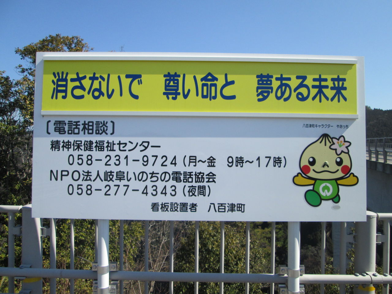 最初の自殺があったのは橋開通前年の09年5月。町外の女性だった。昨年は過去最悪の6人が飛び降り、今年も既に3人を数える。町は15年2月、大型看板2本を立て、自殺防止のメッセージや相談先の電話番号を記したが、効果はなかった。自殺者の多くは町外から来た人で、橋のたもとの駐車場にマイカーなどでやって来るという。