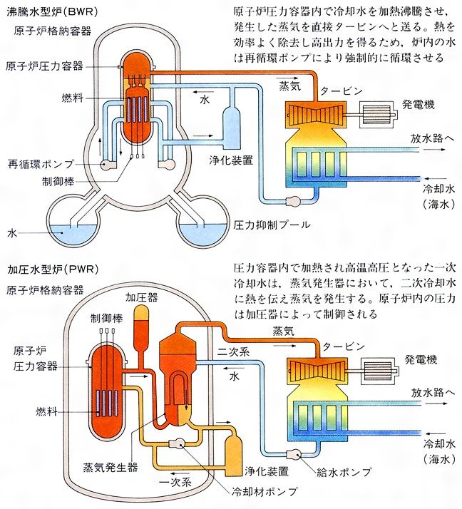 しかし、関東以北の原発は上のタイプで電気が止まっても核反応は止まらない。福島の原発は上のやつ。