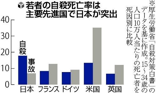 死因1位が自殺なのはまだいいとして、割合的に明らかに突出してるのが問題なんだよ。医療や衛生、治安の良さを加味しても高過ぎ
