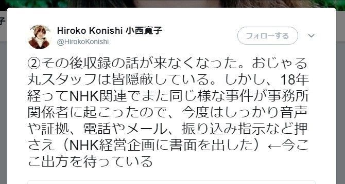 また、小西さんは18年経って、「NHK関連でまた同じ様な事件が事務所関係者に起こった」とNHK絡みで新たなトラブルが発生したと明かした。今回の件については、音声だけでなく、電話やメール、振り込み指示など、その他の証拠も押さえているといい、NHKの経営企画局に書面を出し、回答を待っている状態だという。