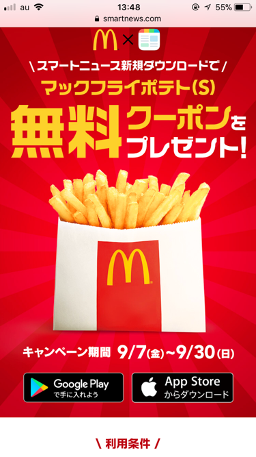 【乞食速報】スマートニュースをダウンロードするとマックのポテトが無料!