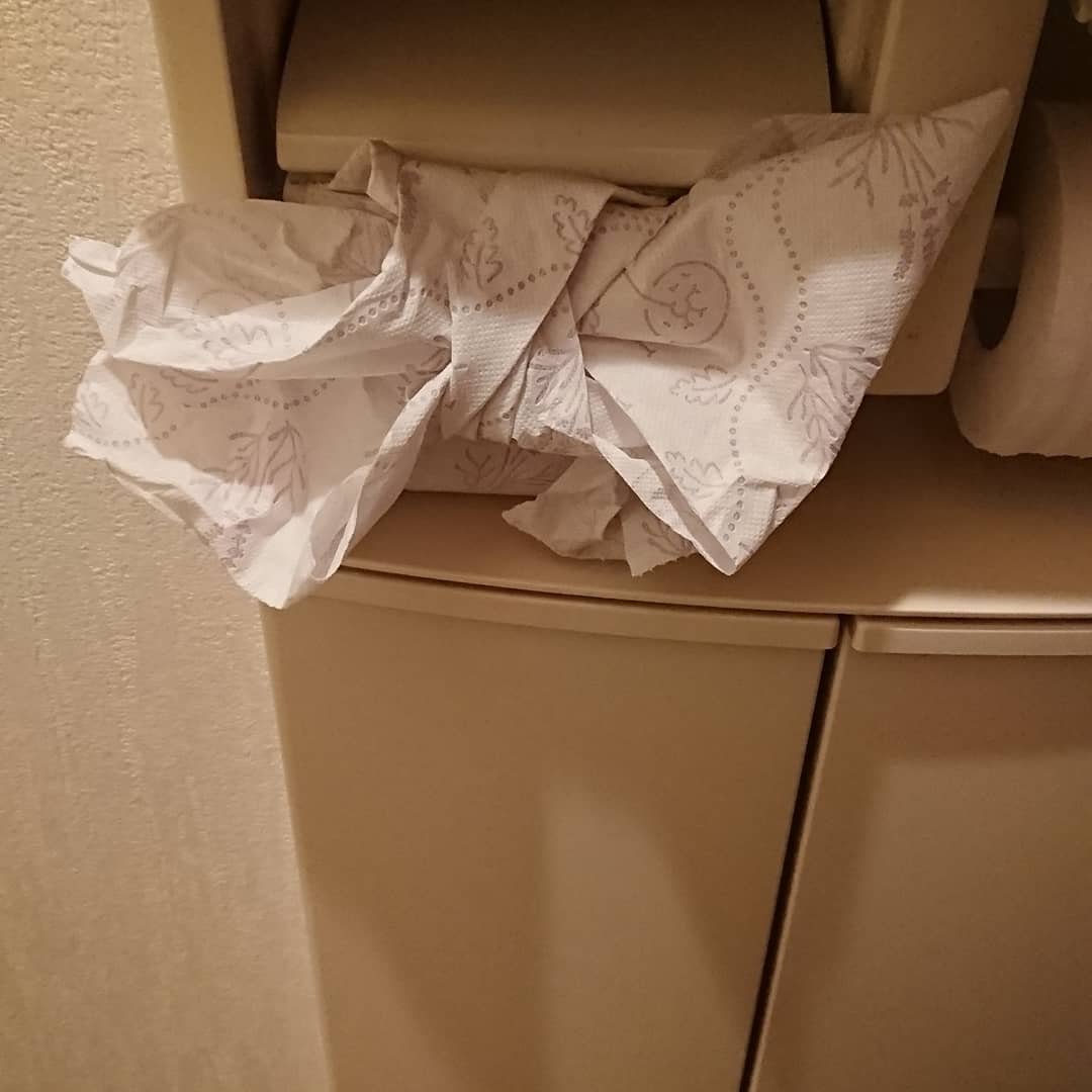 …ホワンホワンホワンホワン…(*あ、妄想が終わった音です)…と、ちょっと想像しただけで、「かわいいけど、これは公衆トイレではやったらあかん」とわかりそうなものですが…。まあ家でやるなら、何も問題ないんだけどね。確かにパッと見たときにかわいいし驚きがあるから、友達が来る前や、家族を驚かせるためにキレイな手でやればいい。実際にSNS上でも、自宅で花柄や色付きのトイレットペーパーでリボンを折ったり、バラやハートを折った写真をたくさんの方が公開しているし、中には兜や折り鶴などなどを折るツワモノもいて、見ているぶんには楽しいですから。