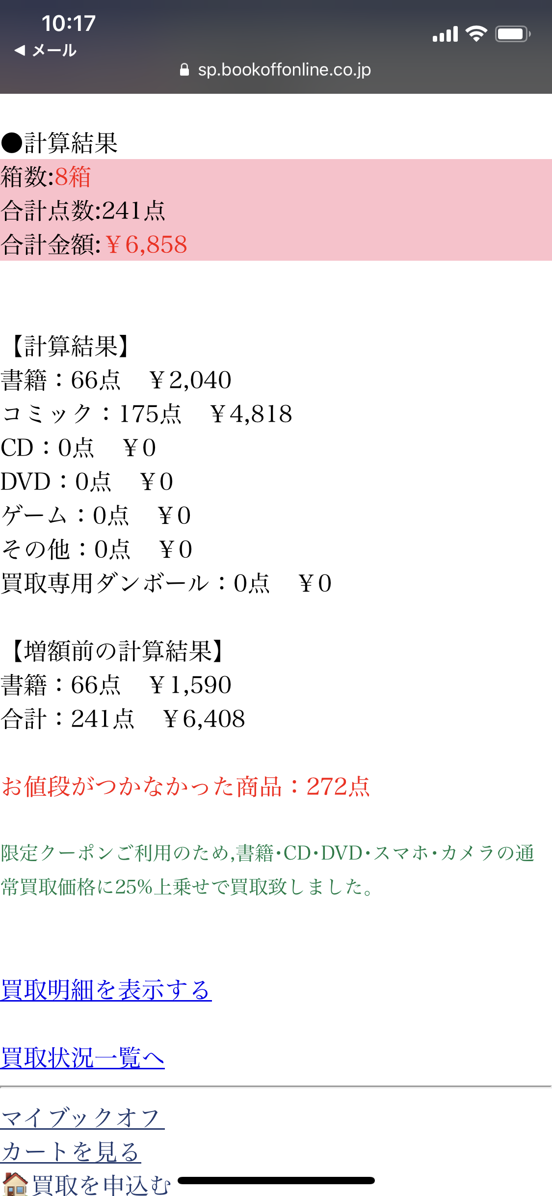 状態メチャクチャよかったのばかりだから買取不可なんてほとんどなかったけどマイナーなの多かったから5円とかばっかだった。しかも〜巻までならセットで1冊200円とか書いてあるのになにかとイチャモンつけて買取価格落としてきたのを覚えてる。2時間くらいまったのに後悔しか残らなかった。ちなみに千葉県松戸市の古本市場って所
