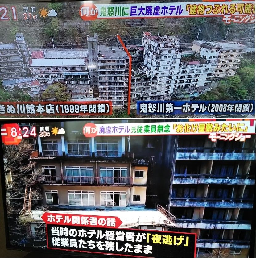 2008年に閉鎖された鬼怒川第一ホテルは増築を繰り返し500人以上が宿泊できたという。このエリアで最初に閉鎖されたホテルはきぬ川館本店で、ホテル関係者によると当時のホテル経営者は従業員を残したまま夜逃げしたという。それでも従業員たちは自主的に営業を続け、売上金を料理などの仕入れに充てていたという。鬼怒川温泉の一部のホテルでは産業再生機構の支援を受けて再建を進めることができたという。日光市の担当者によると、撤去は本来所有者の責任であるが、連絡がつかないので撤去を要請できない状況となっており、空家等対策特別措置法で市が危険と判断した場合は撤去は可能となっているという。