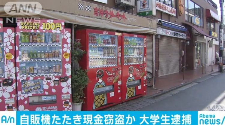 東京・武蔵野市で自動販売機を強くたたいて誤作動を起こす手口で釣り銭約1万2000円を盗んだとして21歳の大学生の男が逮捕されました。