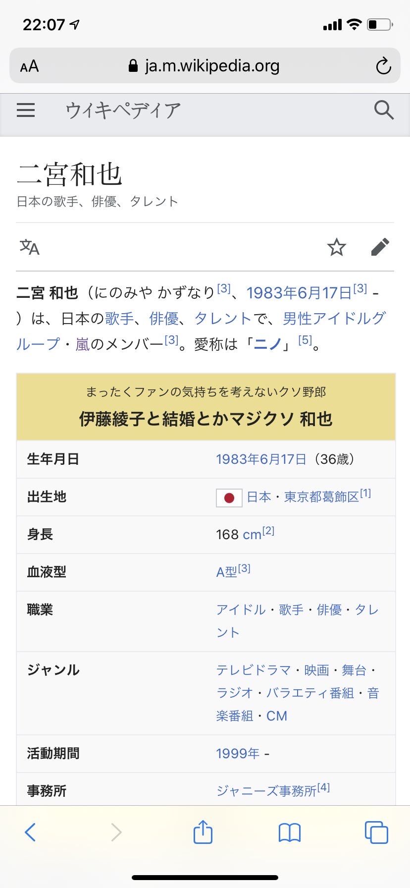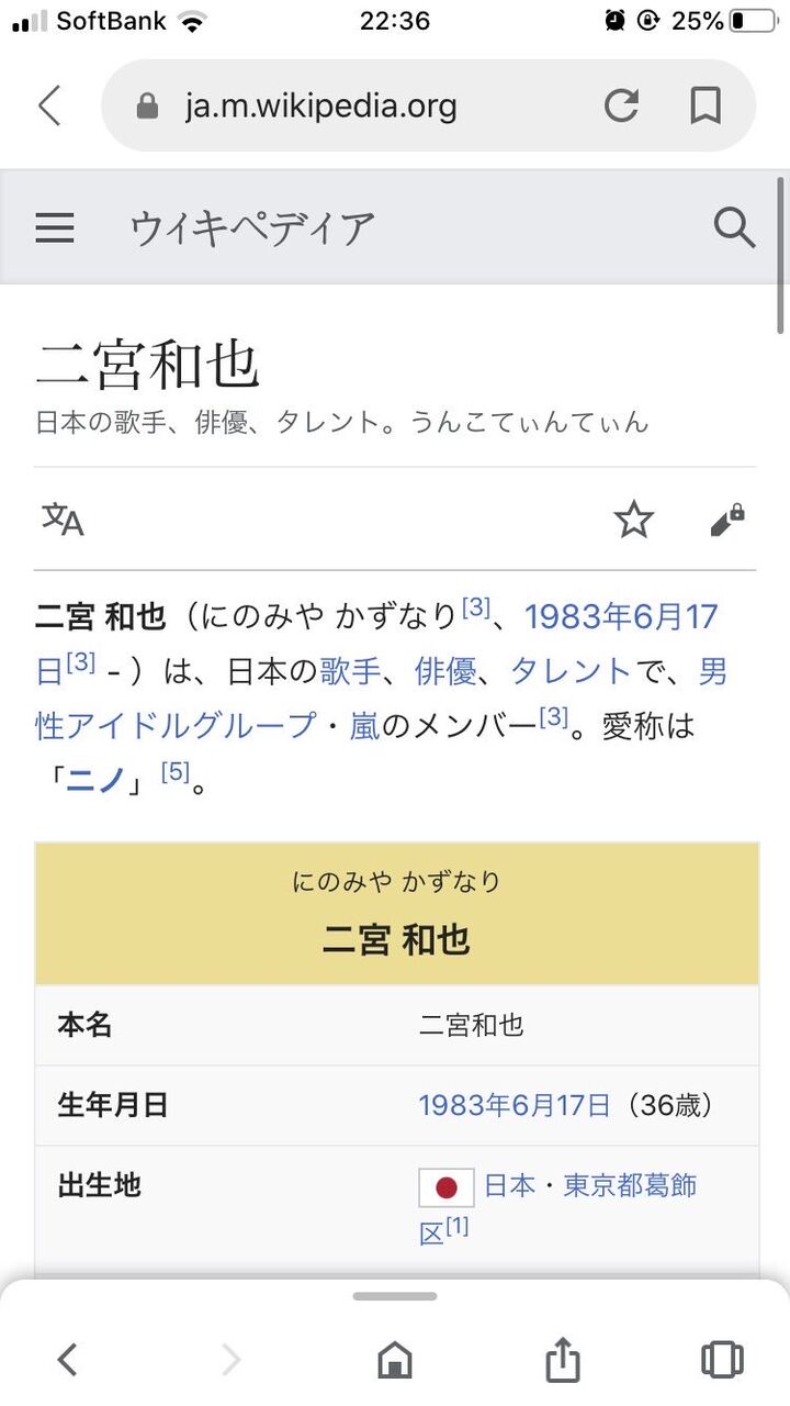 二宮クラスの有名人こウィキ改変しても秒で直されそうやしそういう意味ではこのスクショは貴重な一枚やな