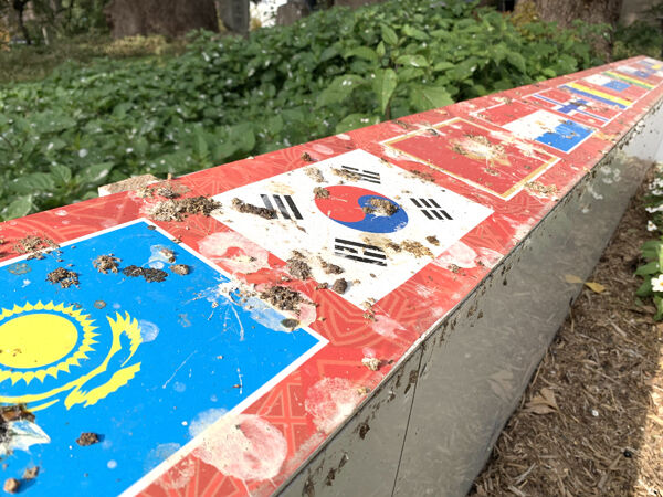 熊本市の中心市街地でカラスの「ふん害」が広がっている。樹木に集まる大群がふんを落とし、道路や公園のベンチなどが汚されているほか、熊本県で開催中の女子ハンドボール世界選手権のPR看板も受難。出場24カ国の国旗が描かれた部分にも汚れがこびりついている。