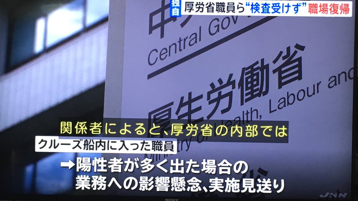 【絶望】厚労省、クルーズ船で業務していた職員にコロナ検査を受けさせず職場復帰させる 陽性者が多く出たら仕事が回らなくなるため
