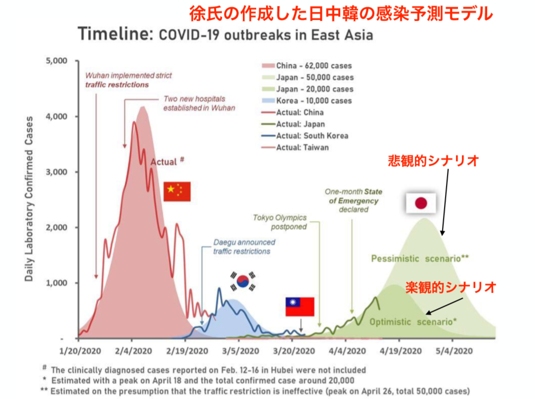 徐氏が算出した「楽観的シナリオ」によれば、日本の感染のピークは4月16日となり、累計の感染者数は2万人以上に達するとされる。一方、「悲観的シナリオ」によれば、日本の感染のピークは4月26日になり、1日あたりの感染者は2000人を超え、累計の感染者数は5万人以上に達すると見ている。