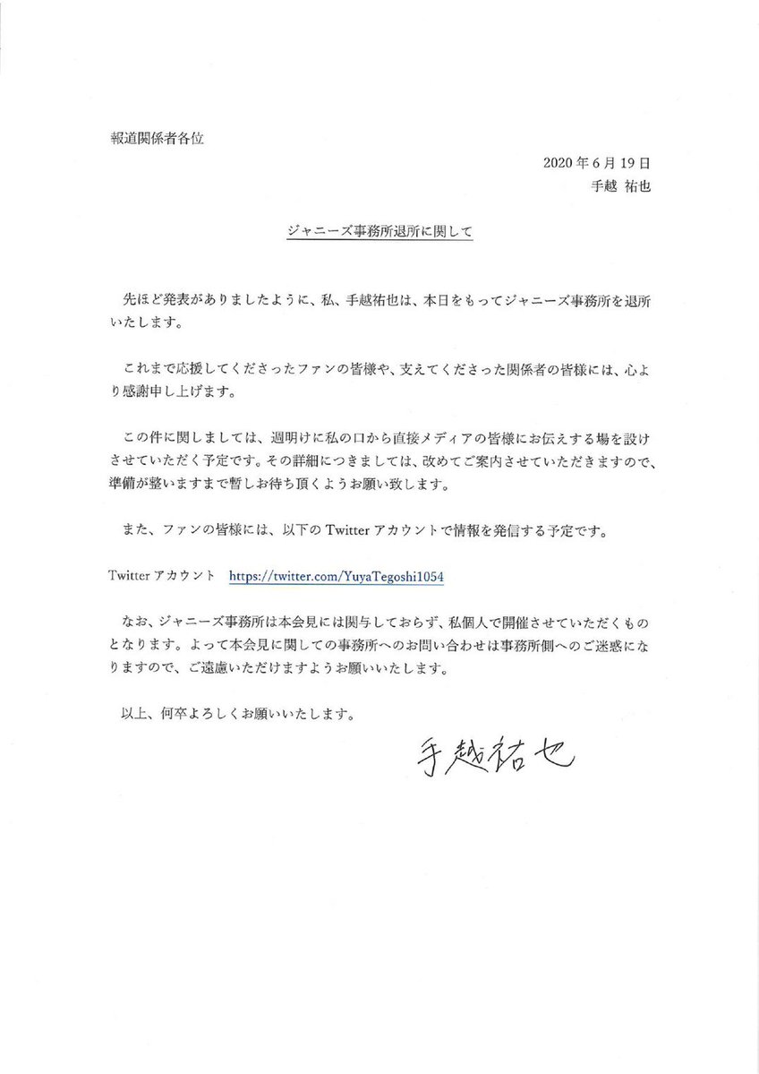 手越祐也です!この度、長年いたジャニーズを退所して独立することになりました。詳しくは週明けにでも、今後の活動についてご報告できればと思うので、引き続き、よろしくお願い致します。