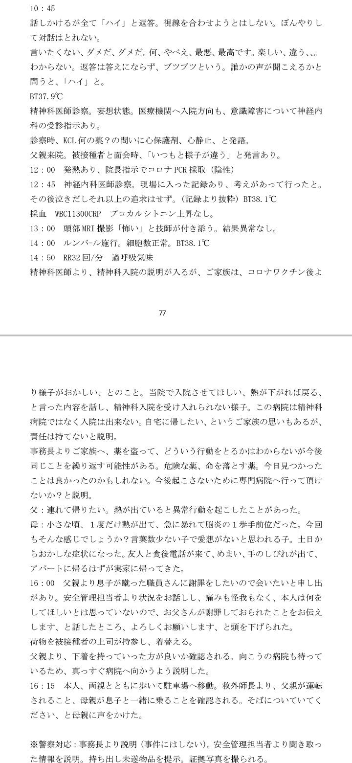 概 要:病院内で、医薬品(KCL)を無断で持ちだしている行為を発見され暴れ、取り押さえられる事件があった。精神科診察により、妄想状態、精神障害と診断され、精神科病院へ家族が乗用車で搬送中に、家族の制止を振り切り飛び降り死亡するに至った。これまで精神疾患の既往はなく、通常に勤務。この行為の4日前(金曜日)に新型コロナワクチン(ファイザー)接種を受けている。土、日の行動は不詳であるが、38 度の発熱はあったらしい。前日 26 日(月)は37.1 度の発熱あり、休息指示を受けた。事象発生日当日(火)も 37.9 度の発熱あり。ワクチン接種が誘因となった疑いを否定できず報告するもの。