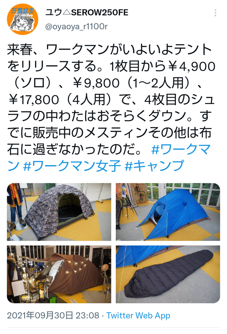 引用元:【悲報】ワークマン、4900円でテントを発売してしまう ・https://swallow.5ch.net/test/read.cgi/livejupiter/1633054263/