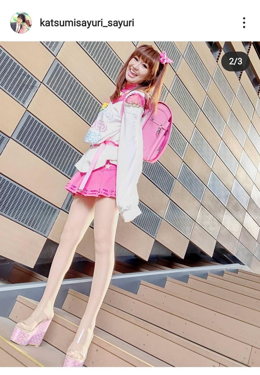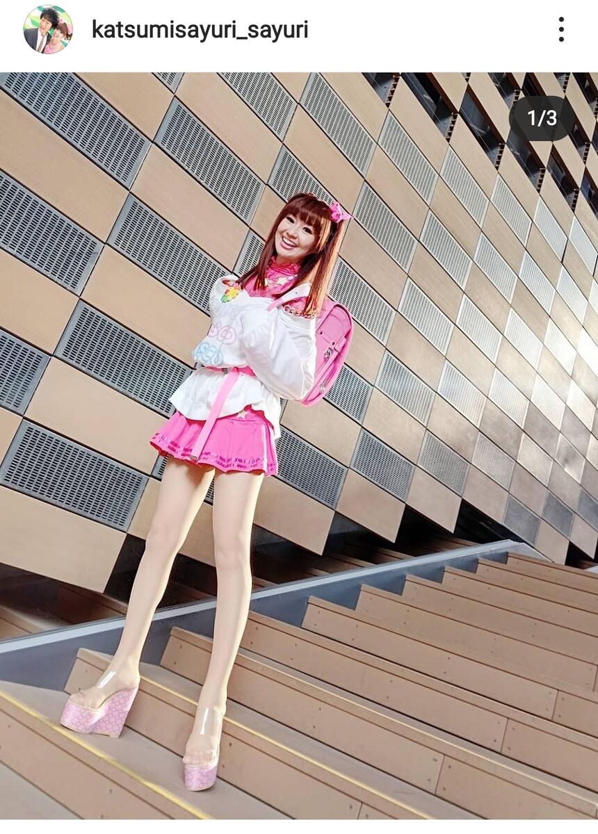 「#30年物ノーブランドマイクロミニ」「#ノーブランドガチャベルト」「#800円めちゃめちゃ愛用スター過ぎるネックレス」など着用アイテムを説明し、ランドセルについては「#50歳誕生日のかつみさんプレゼント」「#byニトリ」と告白。「#中身は100%お化粧品」と明かし、「#スタイリストTAKARINさんから#最先端のお言葉#頂戴しました」とつづった。