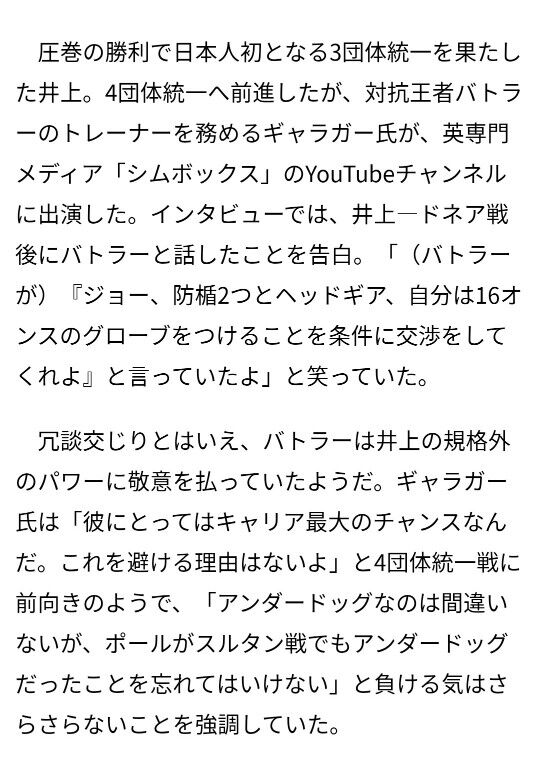 今のWBAフェザー級チャンピオンが井上とスパーしてボコボコにやられてダウンしてたからマジでスパー相手がいないっていう