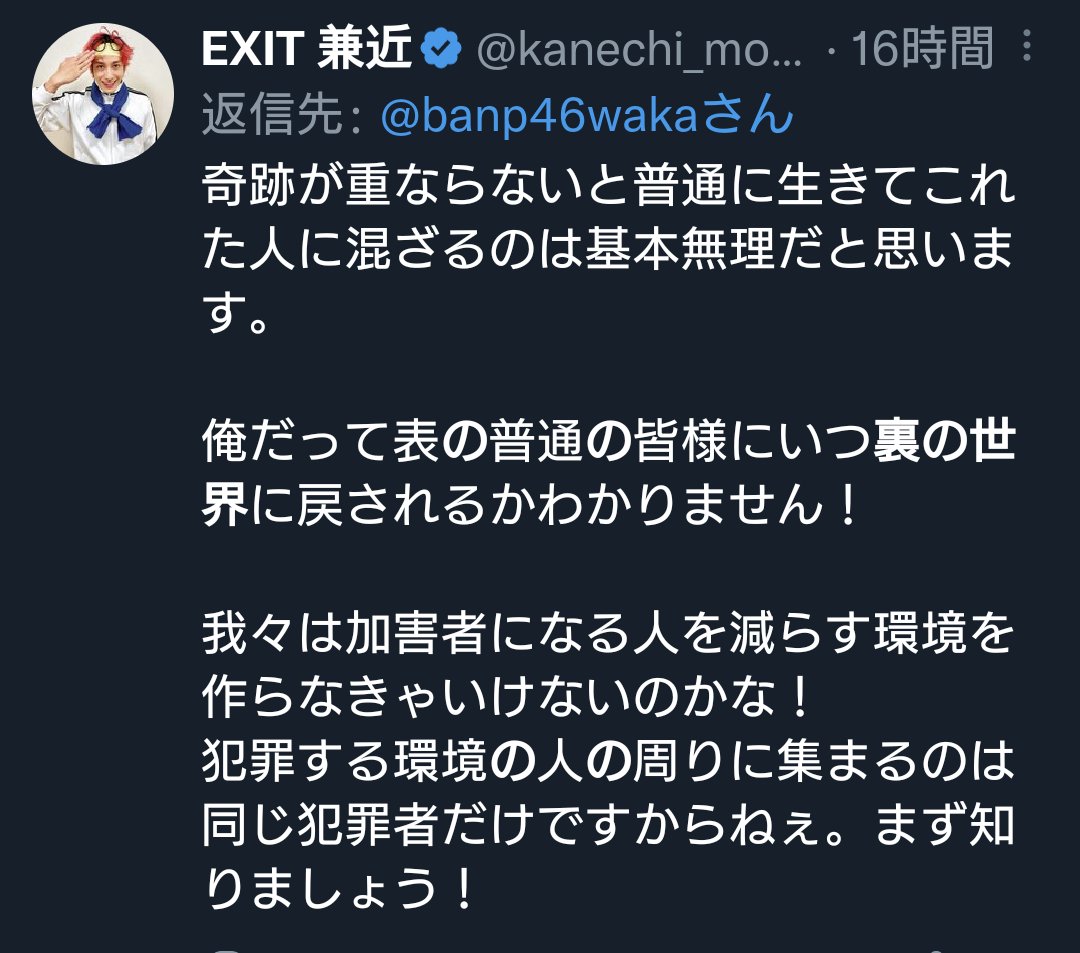 EXIT兼近さん、正論 「表の世界の人たちが自分を裏の世界に戻すかもしれない」