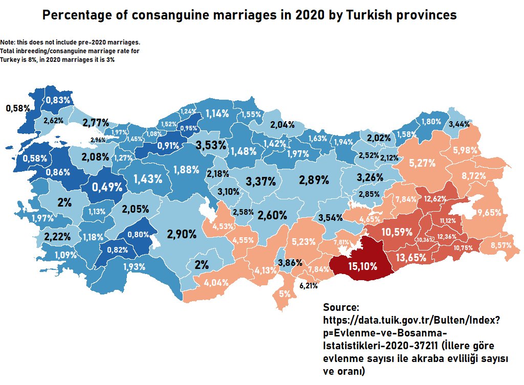 イトコ婚率をみると、トルコ地域では低く、クルド地域では高く、アラブ地域ではもっと高い。