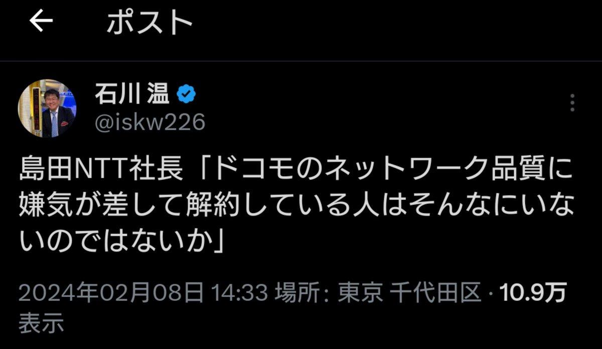 島田NTT社長「ドコモのネットワーク品質に嫌気が差して解約している人はそんなにいないのではないか」