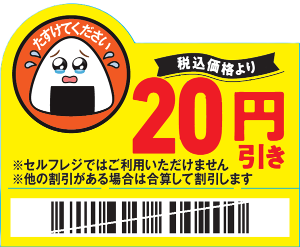 今回の実験では、おむすびや弁当などに貼る値下げシールに、キャラクターの「たすけてください」というメッセージと涙目の表情を特徴としたキャラクターを掲載。