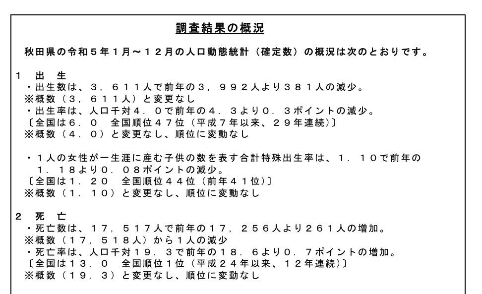 【悲報】秋田県崩壊の危機 年間出生者数「3,611」死亡者数「17,517」 [237216734]