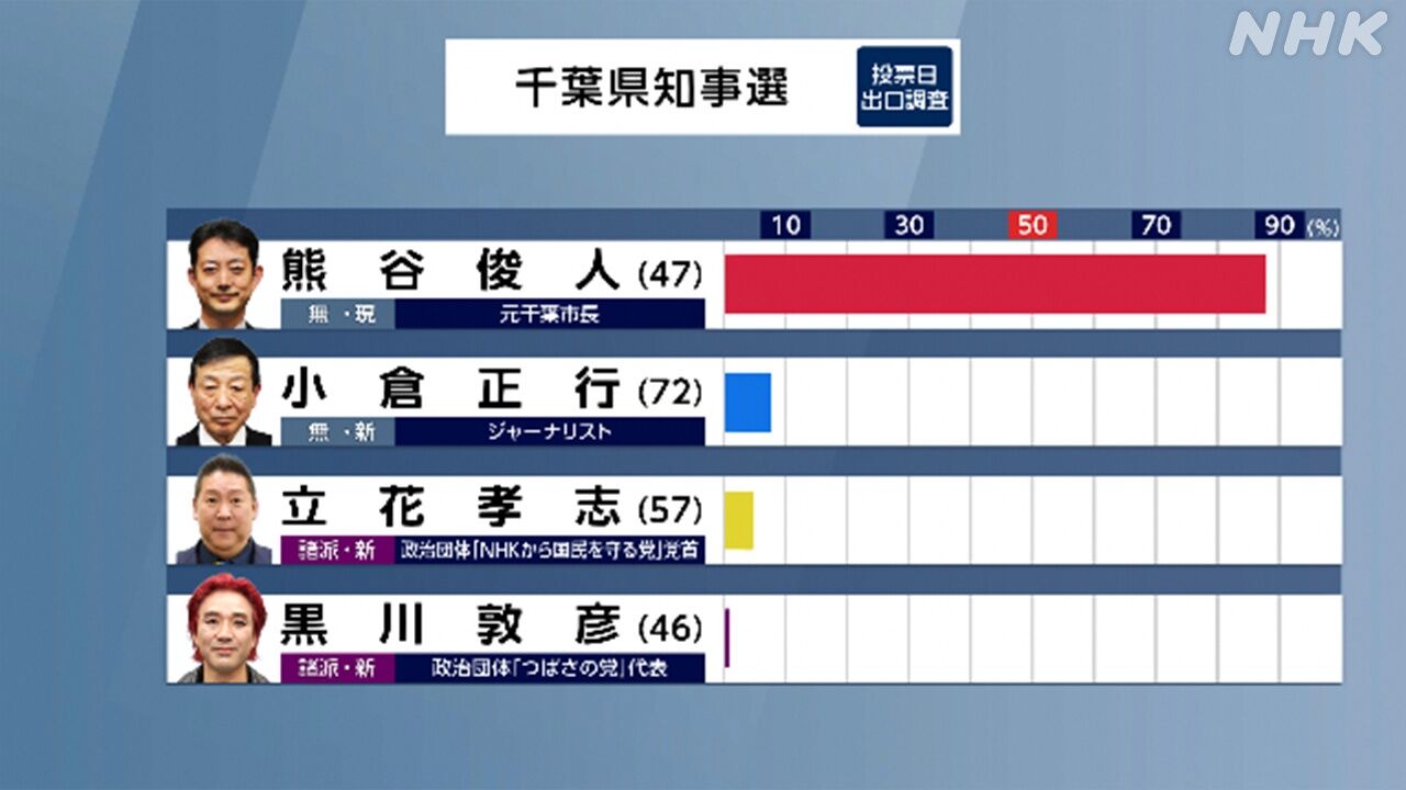 任期満了に伴う千葉県知事選が16日投開票され、無所属現職の熊谷俊人氏(47)が再選確実となった。
