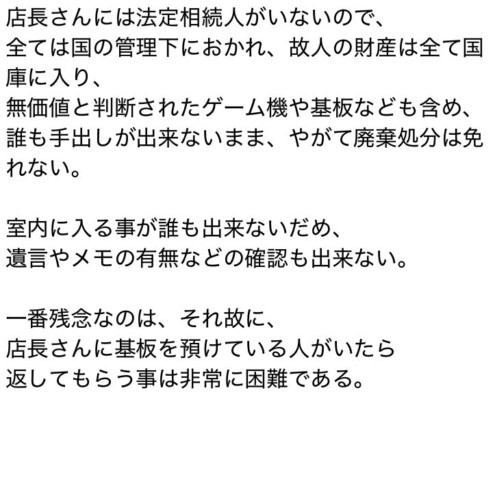 店長さんには法定相続人がいないので、全ては国の管理下におかれ、故人の財産は全て国庫に入り、無価値と判断されたゲーム機や基板なども含め、 誰も手出しが出来ないまま、やがて廃棄処分は免れない。