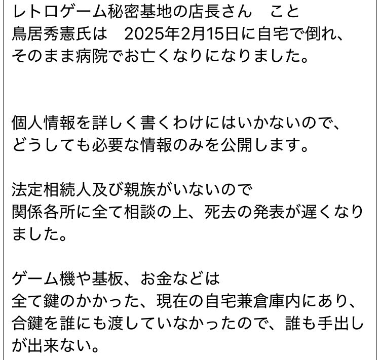 レトロゲーム秘密基地の店長さんこと鳥居秀憲氏は 2025年2月15日に自宅で倒れ、 そのまま病院でお亡くなりになりました。