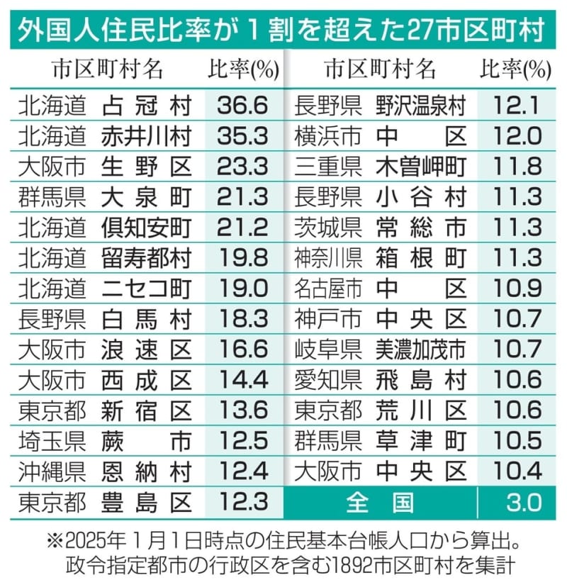 外国人住民比率が20%を超えたのは、占冠村のほかは北海道赤井川村、大阪市生野区、群馬県大泉町、北海道倶知安町で、5区町村に上った。10%超は27市区町村で、工業地帯や観光地のほか、古くから永住者が多かった地域もある。
