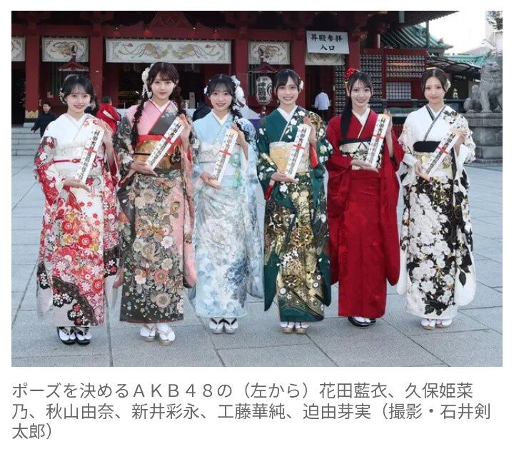 AKB48の秋山由奈(20)、新井彩永(20)、工藤華純(20)、久保姫菜乃(19)、迫由芽実(19)、花田藍衣(20)が12日、東京・神田明神で行われた「二十歳のつどい2026」に出席した。