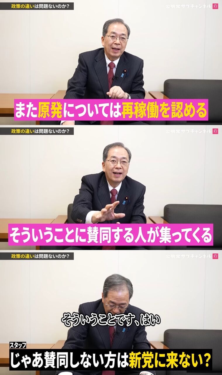 立民側から参加呼び掛けを受けたが断りを入れたと明かし、新党が「中道改革」を掲げていることについて、「中道って具体的に何なんですかね。そこは良く分からない」と疑問を呈した。「抽象的なもので、与党と野党に分かれていた政党がいっしょになる。基本軸が極めてあいまいな『中道』で、国民の理解を得られるのか、見定めていくことは必要だ」と指摘した。